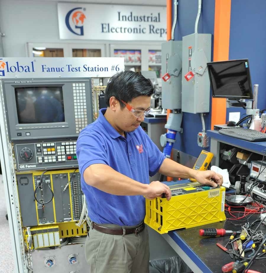 Choosing the best company to make repairs to your Fanuc equipment can seem like a daunting decision. You need a company you can depend on for quick turnaround, cost-effective pricing and reliable service. Many companies come to the table with proposals that promise all of this and more. So how do you know which company to choose for your Fanuc repairs? Choose the company that OEMs choose for their own repairs. Choose Global Electronic Services. What sets us apart from the competition? It is our commitment to customer service and providing superior repairs to Fanuc equipment. Our commitment to providing the best service starts the minute you call us. Our phones are always answered live by our informed, professional staff who can answer questions about repairs to your Fanuc equipment. Their expertise and ability to provide assistance regarding the Fanuc repair process is unmatched in the industry. Once you have initiated a repair with us for your Fanuc equipment, you will begin to experience the rest of the Global Electronic Services Advantage. Our commitment to providing you with superior service extends throughout the repair cycle. Our standard repair turnaround is 1-5 days, with free 1-2 rush service available. We provide free evaluations on all repairs for your convenience and back all of our service with an 18 Month In-Service Warranty. To ensure that you are getting the best value in the industry, we back our prices with a Global Price Guarantee, ensuring we will beat any competitor's price by 10%. Your Fanuc repairs are completed by a trained technician. Before any part is shipped back to you, we test each component to guarantee peak performance. We use a Fanuc robot and controller for full function testing. We repair Fanuc equipment including Servo drives and motors, workstations, Quickpanels and teach pendants. When you choose Global Electronic Services for your Fanuc repairs, you can be confident you are getting the best service, the best price, and superior repairs at all times. To learn more and to get a quote for your Fanuc repair, please call 877-249-1701.